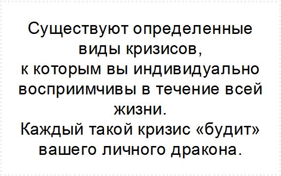 Как и у Ирины, у вас есть определенные виды кризисов, к которым вы индивидуально восприимчивы в течение всей жизни. Каждый такой кризис «будит» вашего личного дракона, он вылетает из своей пещеры в горе и снова летит превращать вас в ржавую деталь или наполнять мировой скорбью.