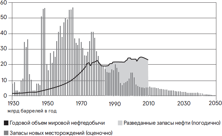 График 1. Растущий разрыв между ежегодным объемом мировой добычи нефти и объемом разведанных запасов с 1930 по 2050 (прогноз) год[15]