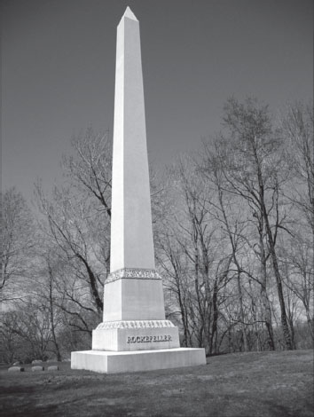 Сказать, что выбор кладбища Лейк-Вью был продиктован природной экономностью (скупостью, по свидетельству многих очевидцев. – Л. К.) Рокфеллера, нельзя. Участок «украшает» возведенная еще при жизни Рокфеллера стела из цельного куска гранита, добытого в Вермонте. Высота стелы с квадратным основанием 5×5 футов (1,5×1,5 м) составляет 51 фут 9 дюймов (15,77 м), а вес – 73 тонны.