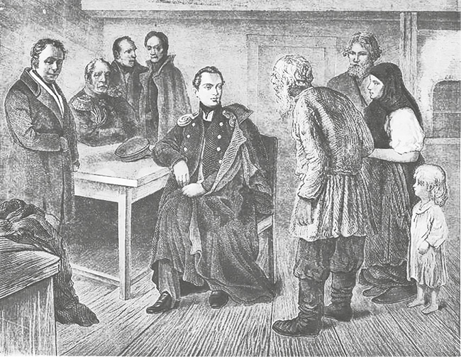 Цесаревич Александр Николаевич во время поездки по России в крестьянской избе. История царствования императора Александра II (в картинах).