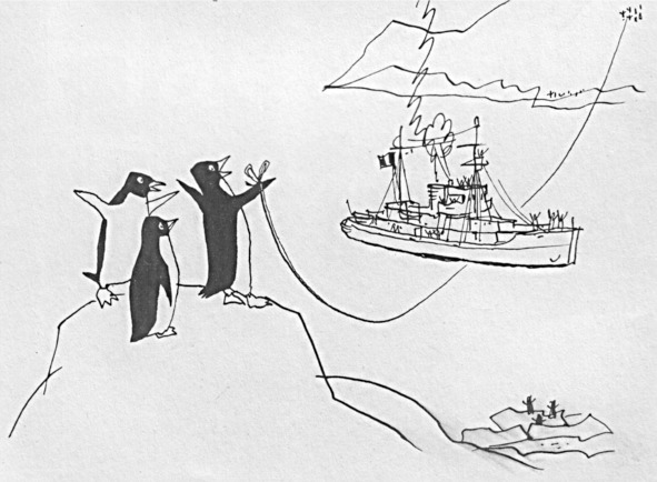 Разговор сначала был чисто технический. Я рассказал о программе наблюдений, об особенностях прохождения радиоволн в полярных и приполярных областях. Его эта тема очень заинтересовала, т.к. она тесно связана с планами его дальнейших путешествий. Затем разговор перешел на бытовые темы. Кусто пригласил меня посетить судно и, может быть, если позволит время продолжить разговор об особенностях работы компараторного пункта (о прохождении радиоволн в южно-полярной зоне).