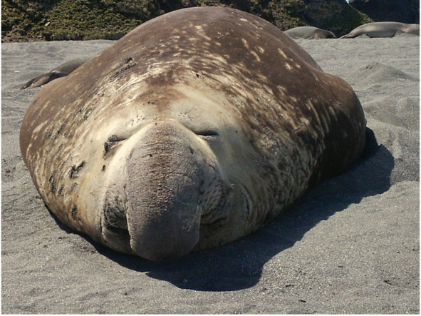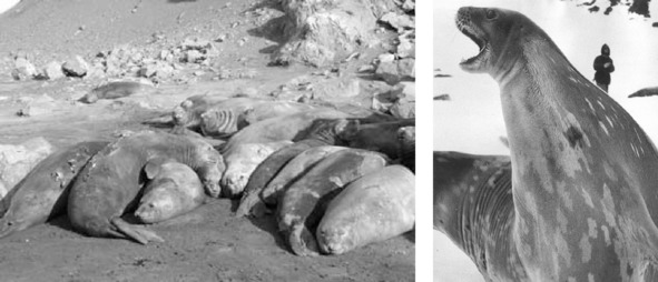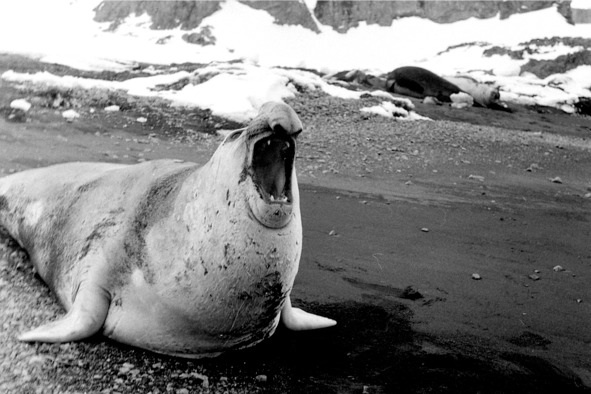 Когда сквозь дымку над океаном пробивается луч солнца и все вплоть до горизонта окрашивается алым цветом. Наблюдая за тюленем, лежавшим неподалеку, выжидая и ловя его позу для фотографии, я споткнулся о какой-то валун грязно-коричневого цвета, который вдруг ожил и резко стал двигаться в обратную строну от меня к воде. Оглянувшись, я увидел оскаленную морду и громадные красные глаза морского слона. Кто испугался больше, думаю, что я. Слон двигался к воде, постоянно оглядываясь на меня. Видимо, он почувствовал во мне своего злейшего врага – человека. Я же впервые увидел южного морского слона. Повсюду суетятся пингвины-непоседы, а вон там слева в песчаной ложбине лежбище слонов (около 40) – это гаремные самки, они меньше размерами самцов и у них более тупая морда. Самец намного крупнее и у него более характерная морда – на ней специфический мешок-хобот, который раздувается, когда слон переполнен какими либо эмоциями. Из—за этого хобота его и назвали слоном.
