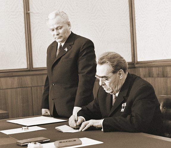 Заведующий общим отделом ЦК КПСС К.У. Черненко и генеральный секретарь ЦК КПСС Л.И. Брежнев во время выписки партийного билета № 00000001 на имя В.И. Ленина. 1 марта 1973