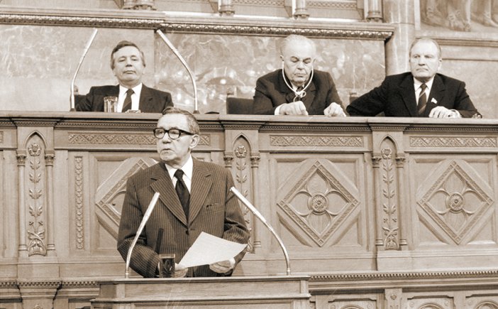 Министр иностранных дел СССР А.А. Громыко, находящийся с официальным визитом в ВНР, выступает на заседании парламента Венгрии (в президиуме первый секретарь ЦК ВСРП Я. Кадар). Будапешт, 1980