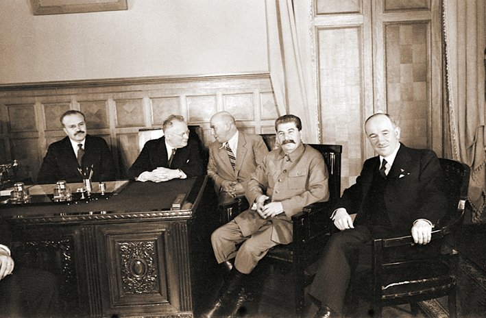 В.М. Молотов, М.М. Литвинов, полпред СССР в Чехословакии С.С. Александровский, И.В. Сталин, министр иностранных дел Чехословакии Э. Бенеш. 9 июня 1935