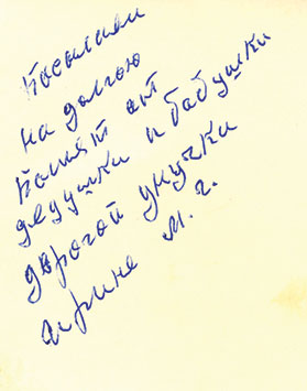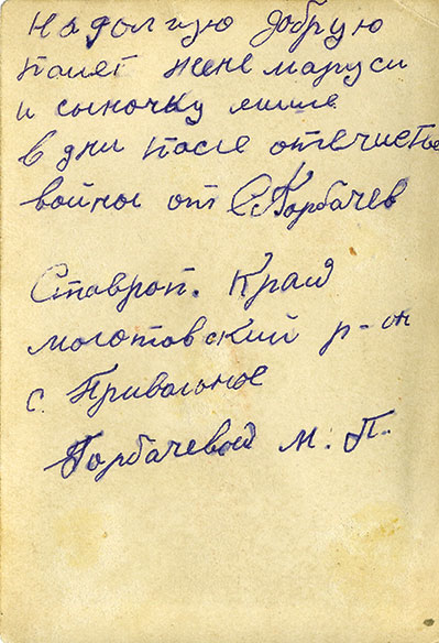 Эту фотографию Сергей Горбачев (отец), видимо, прислал жене незадолго до демобилизации (будем снисходительны к орфографии)