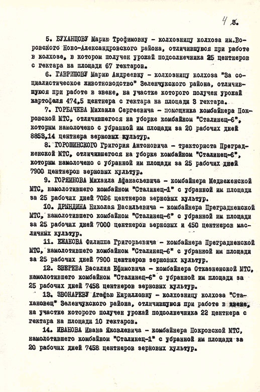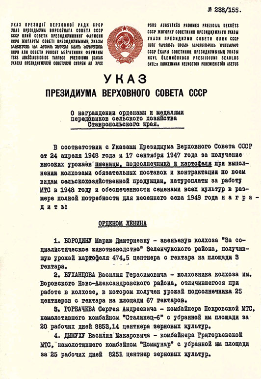 Указ Президиума Верховного Совета СССР о награждении орденами отца и сына Горбачевых: отец под номером 3, сын под номером 7