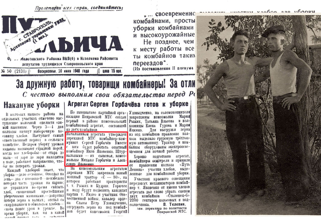О награждении Горбачева и Яковенко сообщила местная газета, поместив фото их сыновей – штурвальных: Михаила (справа) и Алексея