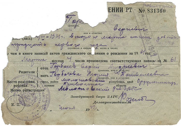 Зато сохранилось свидетельство о рождении Горбачева, выданное 4 марта 1931 года. Можно предположить, что в Привольном им успели полакомиться мыши