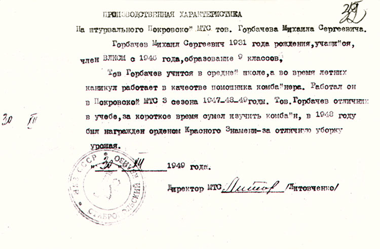 Этот «факт» иллюстрирует механизм возникновения мифов, которых вокруг фигуры Горбачева появится масса. Хотя кто-то что-то такое рассказывал Кучмаеву, скорее всего путая Привольненскую начальную и Молотовскую среднюю школы, Таубман ссылается на документы архива новейшей истории Ставропольского края, из которых явствует, что директором школы в Молотовском была вовсе женщина, давшая Горбачеву 5 июня 1950 года, в последний месяц учебы в 10-м классе, рекомендацию для вступления кандидатом в ВКП(б).