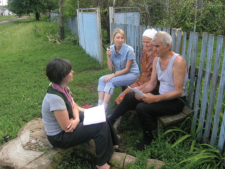 Экспедиция краевого краеведческого музея. Татьяна Ганина (лицом к нам) записывает беседу руководителя экспедиции с жителями Привольного