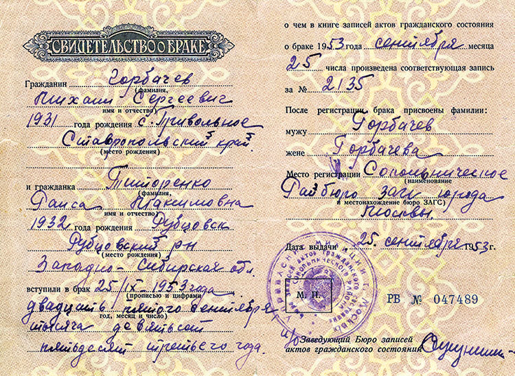 После третьего курса Горбачев поехал домой, где снова намолотил с отцом гору зерна и получил большие деньги по тем временам – почти тысячу рублей. Этого хватило на платье для Раисы из итальянского крепдешина и на костюм ему из «дорогого материала», который назывался «Ударник», к свадьбе, а белые туфли невесте пришлось одолжить у подруги. Брак был зарегистрирован 25 сентября 1953 года, свадьбу сыграли в годовщину Великой Октябрьской социалистической революции 7 ноября в диетической столовой. Пили шампанское и «Столичную», и Млынарж посадил на свой заграничный костюм масляное пятно – вот и все подробности, которые Горбачев сообщает в мемуарах.