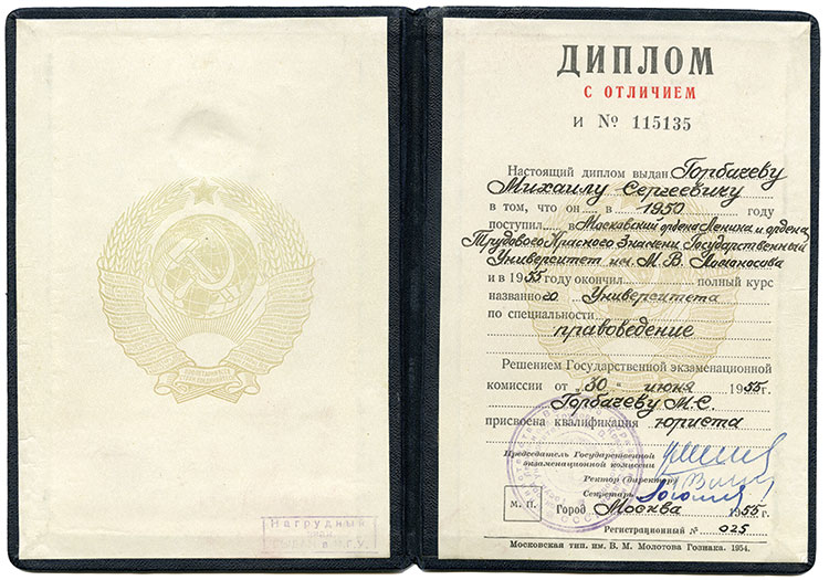 Диплом об окончании М.С. Горбачевым юридического факультета МГУ