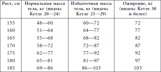 Теперь, когда мы выяснили некоторые подробности о росте, перейдем к весу. Самым точным способом определения должного веса считается индекс Кетле, который вычисляется по формуле: вес в килограммах разделить на квадрат роста в метрах. Если ваш рост, например, составляет 1,65 м, а квадрат его, соответственно, 2,7 (1,65x1,65), то при весе в 60 кг мы получаем индекс, равный 22 (60/2,7). Нормально, если этот индекс находится в пределах 20–24. При показателях 25–29 вы обладаете избыточной массой тела, а если индекс более 30, то у вас, извините, ожирение. По приведенной ниже расчетной таблице 1 вы сможете оценить свои параметры.