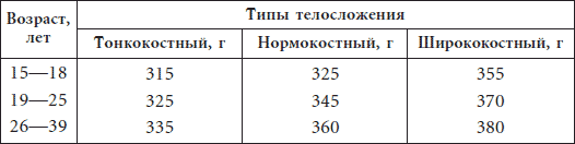 Согласно индексу Кетле, на каждый сантиметр роста астеничные тонкокостные женщины должны иметь 325 г веса, нормокостные – 350, а ширококостные – 375 г. Более точно, в зависимости от возраста, эти показатели приведены в таблице 2.