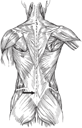 Выступающие части остистых отростков спины, которые легко заметить у женщин, не имеющих излишнего веса, также должны располагаться на одной линии (рис. 6). Плечи и выступающие углы лопаток должны находиться на горизонтальных линиях. Ромб Михаэлиса, образуемый четырьмя углублениями таза и позвоночника (указан стрелкой на рис. 6), должен быть правильной формы. Его изменение свидетельствует об искривлении таза, которое требует коррекции при помощи мануальной терапии.