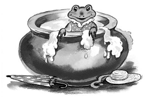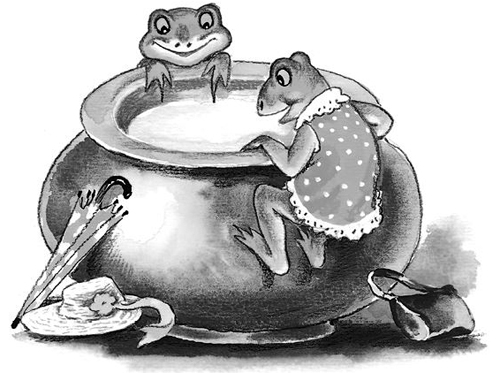 Тогда они стали барахтаться, стали плавать. Но у этого глиняного горшка были очень высокие скользкие стенки. И лягушкам оттуда никак не выбраться.