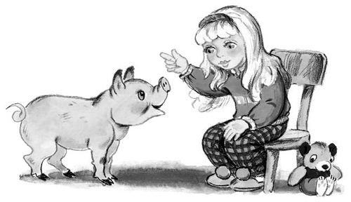 Один раз я видел, как одна совсем маленькая девочка учила поросёнка говорить. Поросёнок ей попался очень умный и послушный, но почему-то говорить по-человечески он ни за что не хотел. И девочка как ни старалась – ничего у неё не выходило.