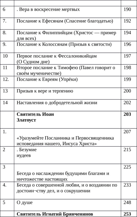 Далее читатель узнает о пророчествах о Иисусе Христе в древние времена, о его родословной и заповедях Нового Завета. Здесь же представлено одно из четырех Евангелий – Евангелие от Луки. Далее любознательный читатель познакомится с жизнеописанием и основными трудами великих подвижников христианства: Апостола Павла, Святителей Иоана Златоуста и Игнатия Брянченинова.