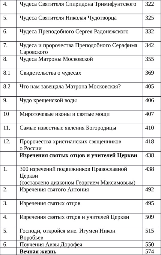 Большой интерес для читателей представляют приведенные в книге чудеса христианские совершенные Иисусом Христом и другими представителями Святоотеческого Учения. Далее приведены изречения святых отцов и учителей Православной Церкви, пророчества христианских священников о России. Учение о вечной жизни. Особый интерес вызывают высказывания Святых угодников Божиих о последних временах.