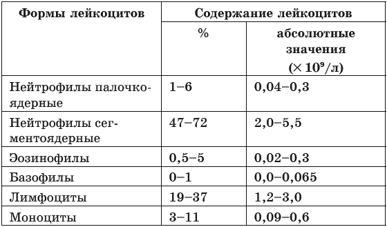 Таблица 1. Лейкоцитарная формула крови и содержание различных типов лейкоцитов у здоровых людей