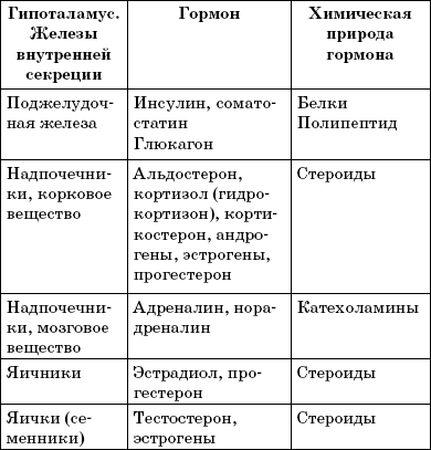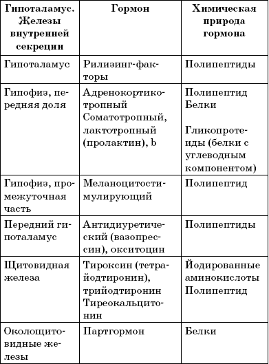 Название и расположение желез внутренней секреции, продуцируемые ими гормоны, химическая природа последних представлены в табл. 1.