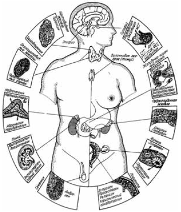 Первую составляют железы, функция которых регулируется тропными гормонами аденогипофиза. Их называют аденогипофиззависимыми железами, или железами-мишенями. К ним относятся щитовидная железа, корковое вещество надпочечников, эндокринные части половых желез. Взаимоотношения между аденогипофизом и железами-мишенями основываются на принципе «обратной связи». Например, аденогипофиз выделяет в кровь тиреотропный гормон, который стимулирует выделение гормона щитовидной железы – тироксина. Поступивший в кровь тироксин угнетает выделение тиреотропного гормона гипофиза.
