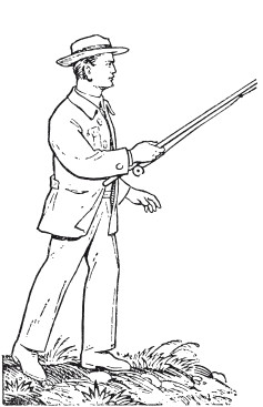 Закидывание лески одноручным удилищем должно совершаться следующим образом. Прежде всего собирают удилище, т. е. вкладывают колена одно в другое, так, чтобы кольца находились бы на одной линии, закрепляют катушку в гнезде и, смотав потребное количество шнурка, сначала не более 4,2 м, пропускают его через кольца и привязывают лоскуточек. Затем становятся саженях в трех (6,3 м) от цели, почти прямо против нее, берут удилище правой рукой над катушкой, повернутой книзу, так, чтобы большой палец лежал сверху на удилище и чтобы остальные пальцы легко обхватывали рукоять удилища без всякого напряжения. Удилище держат почти вертикально, слегка наклоненным вперед, причем кисть руки находится на уровне лица, на расстоянии 15 см от него, а локоть опущен свободно и не приподнят. Затем большим и указательным пальцами левой руки берут лоскуточек, заменяющий мушку, и оттягивают его подальше от туловища, так, чтобы леска висела совершенно свободно, не прилегая к платью.
