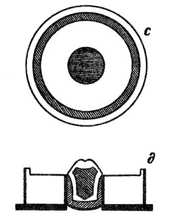 а, с – описанные предметы, б – разрез колпачка, д – наковальня