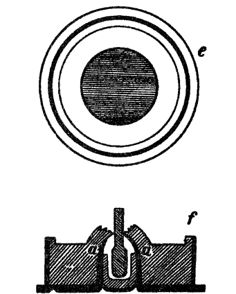 Все до сих пор бывшие у нас в употреблении картонные патроны имели шпенек, на который надевается пистон, и этот шпенек всегда причинял массу хлопот при переснаряжении патронов, и неаккуратное вставление его или немного повредившееся отверстие патрона, в которое он вкладывается, вызывало осечки и давало прорыв газов около пистона. В описываемых французских патронах отдельного шпенька или наковальни нет, а в очень широкое отверстие посреди дна патрона, обложенного внутри латунью, вставляется медный колпачок, под который помещается пистон и конусообразная полая наковальня с большими боковыми дырами, упирающаяся своим основанием в нижний край колпачка. При спуске курка боек ружья ударяет в задок колпачка, соприкасающегося с пистоном, надетым на острие наковальни; происходит воспламенение сильного взрывчатого состава, которым снаряжен пистон, огонь устремляется в боковые дырки наковальни, зажигает часть пороха, наполняющую полость наковальни, и происходит выстрел.