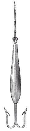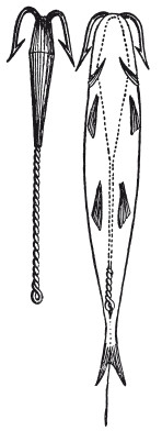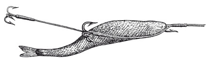 Другой английский способ ужения, называемый trolling и употребляемый почти исключительно для щук, гораздо проще и имеет большую аналогию с нашим блеснением, о котором в Западной Европе вообще имеют очень смутное и неверное понятие. Trolling удобнее тем, что может производиться в довольно травянистых и крепких местах, где spinning невозможен. Этот способ также не требует поплавка, но груз составляет одно целое с крючком, который единственный, двойной, с отогнутыми наружу жалами, как показано на рисунке. Крючки с грузилом для trolling редко, впрочем, встречаются в продаже, и приходится приготовлять их самому. К двойничку прикрепляют поводок из скрученной вдвое медной проволоки, который заливается свинцом. К петельке, которой кончается проволока, привязывают басок и посредством иглы продевают его сквозь всю рыбку так, чтобы он вышел у самого хвоста, и протаскивают проволоку со свинцом, чтобы рыба не могла скользить, хвост ее привязывается к поводку ниткой.