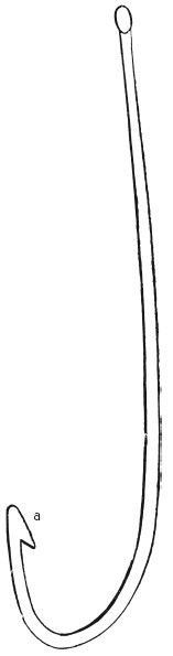 Крючок, или секирка, делается из хорошей стали и воронится; секирка согнута очень мало, а главное – она совершенно тупая. Секирка (рис. 54) вместо острия кончается широкой, но тонкой пластинкой а, напоминающей кухонный, но не отточенный нож. Бородка, или «зазубень», тоже не толстая и не отточена; далее же секирка постепенно утолщается и имеет четырехгранную форму; затем, после загиба, она имеет уже одинаковую толщину вплоть до кольца, которым оканчивается стержень (кольцо это на рисунке не показано). Так как секирка имеет значительные размеры (рисунок сделан в натуральную величину) и самая большая щука не успевает проглотить весь крючок, то бечевка привязывается к кольцу непосредственно и живец (разная «бель») должен быть не менее 200 г, еще лучше в 400 г весом.