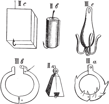 Продажные отцепы имеют форму глухого кольца, внизу утолщенного и снабженного зубьями (см. III, а и в, рис. 38) или без зубцов. Такие отцепы делаются также открывающимися, но это необходимо только для уженья с катушкой. Есть еще отцепки в виде якорька в 4–5 вершков с 3–4 лапками, концы которых несколько приплюснуты; стержень якорька обыкновенно облит свинцом (рис. 38, III, с). Последняя отцепка употребляется иначе, чем все предыдущие: ее закидывают несколько далее того места, где зацепился крючок, и потом понемногу притягивают к себе, причем нередко удается сразу захватить и вытащить корягу или другой подводный предмет с засевшим в него крючком. Обыкновенные же кольцеобразные отцепы продевают сквозь удилище, и они, сбегая вниз по лесе, доходят до крючка и своею тяжестью отцепляют его, а в том случае, если снабжены зубцами, то зацепляют подводный предмет, который и вытаскивается на берег. Понятное дело, бечевка, к которой привязан отцеп, должна обладать значительною крепостью. Лучше всего запасаться для нее толстой голландской бечевой. Длина бечевки зависит от глубины обычных мест ужения, но не должна быть менее 3 сажен.