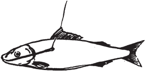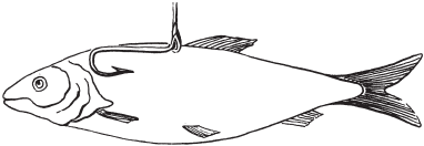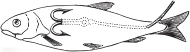 3) Продевают поводок сквозь рот и жабру живца так, чтобы крючок (двойной) торчал у него изо рта. Для того чтобы живец ходил естественнее, поводок иногда пропускают при помощи иглы под спинным плавником (рис. 41).