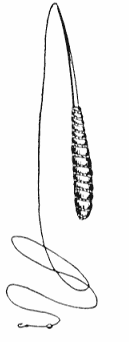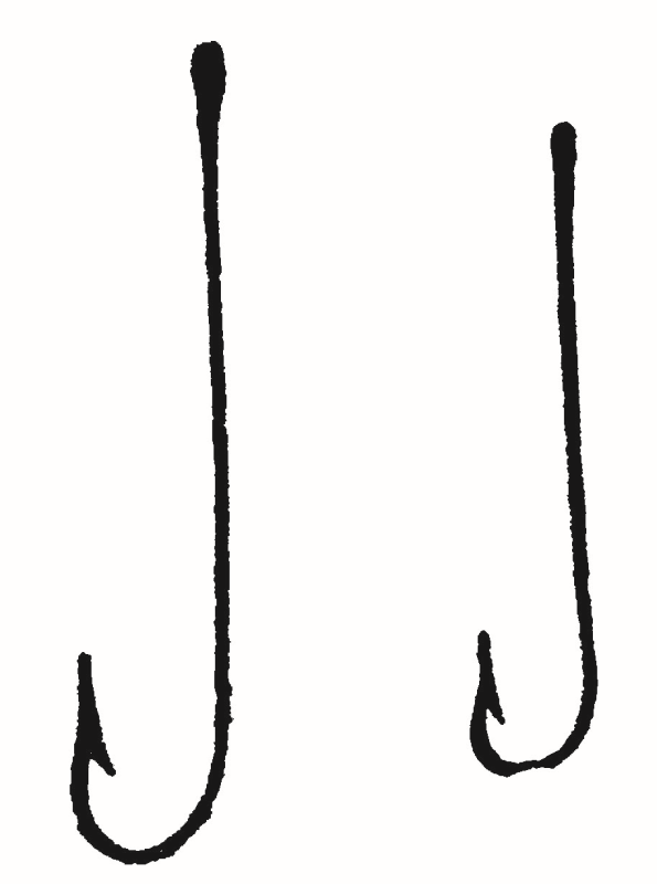 Поплавки для зимнего ужения, кажется, употребляются только на нижней Волге, в Саратовской губернии, и представляют только то удобство, что удильник (мотылек) можно и положить на лед. Делаются они из пробки, коры осокора или из листьев палочника, из которых приготовляется рукоятка зимнего удилища. Для того чтобы на нем не намерзала вода, многие саратовские рыболовы делают такие поплавки, которые тонут от тяжести грузила. Крючки употребляются преимущественно мотыльные, т. е. с длинным стержнем мелких номеров. Московские удильщики ловят обязательно на двойчатки; саратовские тоже на два крючка, но крючки эти привязываются выше груза, как это видно из рисунка. Подмосковные промышленники, удящие ершей для продажи, чтобы сохранить их дольше живыми, нарочно спиливают бородки у крючков; на зауральских озерах также ловят зимой ершей (на мормыша) на крючки без зазубрины, ради большей скорости вынимания крючка. Вообще все рыбы зимой, а ерш в особенности, настолько вялы и так мало оказывают сопротивления, что при хорошем клеве даже неблагоразумно ловить на обыкновенные крючки, ибо вынимать в мороз голой рукой крючок, заглотанный колючим ершом, не особенно приятно. Крючки же без бородки удобны тем, что б. ч. освобождаются из пасти рыбы в тот же момент, когда она выброшена на лед.