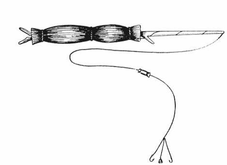 Этим условиям вполне удовлетворяют так назыв. (по своей форме) «колодки» верхневолжских рыбаков и «кобылки» москворецких, устройство которых понятно из рисунков и очень просто: устойчивое деревянное основание небольшого объема, удобное для обхвата одной рукой, и вделанный в него (наглухо или съемный) короткий удильник из можжевелового прутика или китового уса; делаются кобылки больше из березы и имеют около 18 см длины (без прутика) так, чтобы не могли свободно проскакивать через лунку под лед. Многие московские охотники имеют очень хорошо сделанные кобылки, со съемными удильниками, аккуратно укладываемые в шкатулку-ящик, служащий вместе с тем и сиденьем. При хорошем клеве рыболов, попав на место, удит на 3–2, иногда даже на одну кобылку.