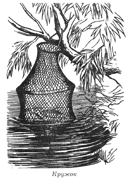 Кружком называют сетчатый мешок, натянутый на три обруча, из коих два одинаковой величины, а третий гораздо уже – вершка 3–5 в поперечнике; к глухому концу кружка, то есть к его дну, привязывают камень или свинцовый конус в ¼ фунта весом, чтобы было удобнее погружать его в воду. Сохранять в нем пойманную рыбу живой можно только при уженьи с лодки; при уженьи же с берега он далеко не так удобен, так как, меняя место, каждый раз приходится вынимать его из воды. Кроме того, в кружок нельзя сажать щук, которые в короткое время прогрызают сетку. Сетка кружка быстро гниет и вообще при вытаскивании не выдерживает большого количества рыбы. Кружок иногда заменяется простой длинной, более или менее частой сеткою в виде мешка.