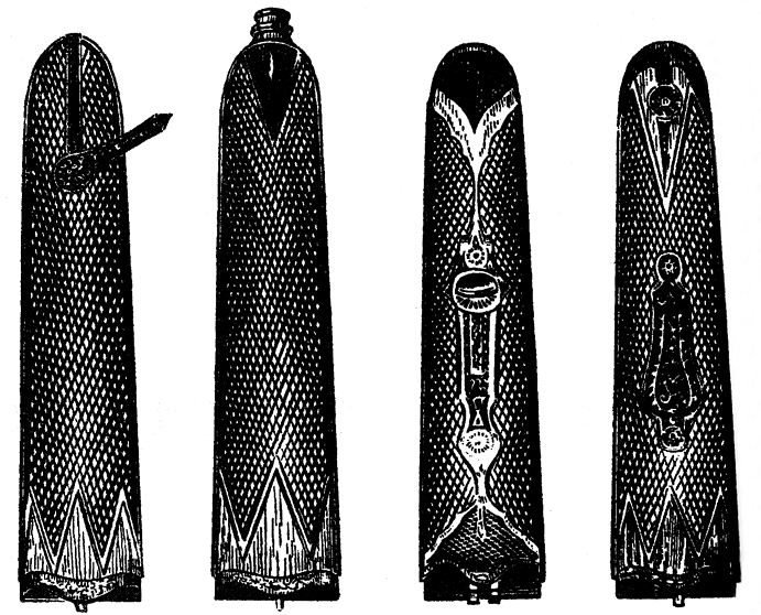 Приборы для лож делаются теперь из вороненого железа, кроме накладок и задней (неподвижной) металлической части цевья у центральных ружей, которые обыкновенно бывают узорчатой (мраморной) калки. Изредка эти приборы делаются из меди, томпака и нового серебра.