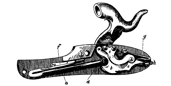 Подкладной замок: а – боевая пружина; b – ладыжка; с – боевая личинка; d – спусковая личинка (цепочка); е – спусковой крючок; f – короткий конец пружины; g – перка; h – хвост (костылек)