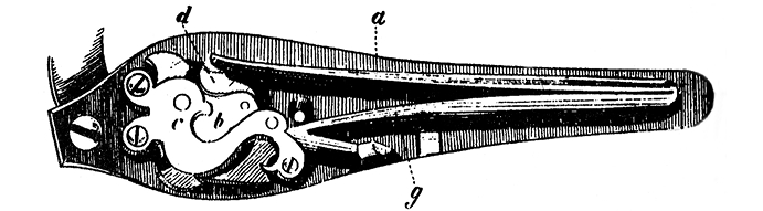 Самый удобный в этом отношении, хотя и некрасивый с виду, есть басовой рычаг (система Веблея), состоящий из не особенно толстой стальной круглой палочки, несколько изогнутой в форме буквы S, с плоской, сверху немного вдавленной горизонтальной пуговкой. Этим рычагом можно отпирать затвор (пружинный), не отнимая руки от шейки ложи, одним нажимом большого пальца на пуговку, но он может управлять только нижним скреплением и слабее других ключей.