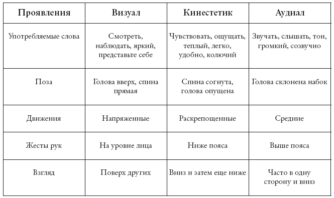 Ярко выраженные визуалы, кинестетики и аудиалы имеют свои специфические особенности в поведении, типе тела и движениях, в речи, дыхании и пр.