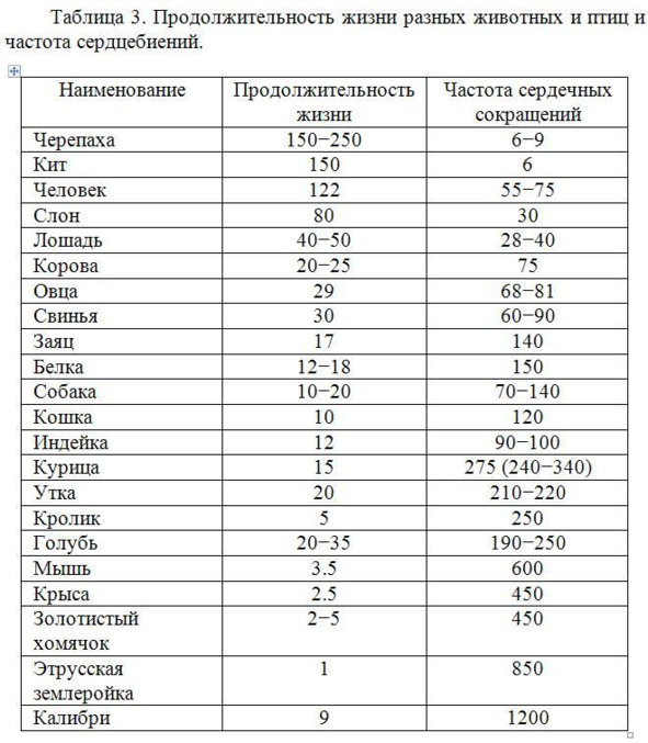Например, у мелких животных (мышей, хомячков, землероек) или маленьких птиц (калибри) обмен веществ чрезвычайно высокий, поэтому у них большая частота сердцебиений, необходимая для снабжения тканей и органов кислородом, но это отрицательно сказывается и на продолжительности жизни, которая у них самая маленькая (см. табл. 3).