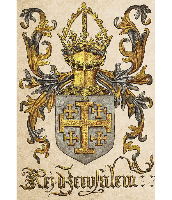 В истории Израиля был и другой государственный герб. 15 июля 1099 г. крестоносцы штурмом овладели Иерусалимом. В память о трудной осаде и кровопролитном штурме, одному из наиболее отличившихся рыцарей – герцогу Готфриду Бульонскому был пожалован герб: в серебряном поле пять золотых крестов, напоминающих о пяти ранах Христа. Впоследствии этот герб стал гербом государства крестоносцев – Иерусалимского королевства.