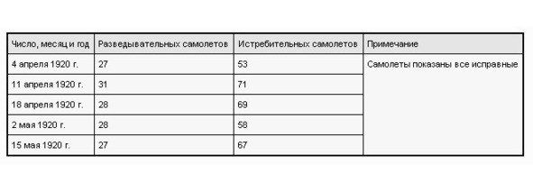 Согласно доклада начальника Главного управления воздушного флота, в мае 1920 г. Западный фронт имел 21 авиационный отряд в которых было 106 летчиков и 45 наблюдателей, 84 исправных и 26 неисправных самолетов. Кроме того, в поездах, мастерских и парках было еще 52 исправных и 58 неисправных самолетов. Таким образом, всего было 136 исправных и 84 неисправных самолетов.