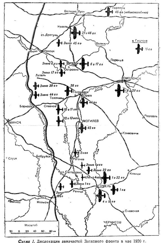 По состоянию на май 1920 г. авиация Западного фронта дислоцировались в Торопце – 45-й авиационный отряд (небоеспособный); в Невеле – 46-й и 31-й авиационные отряды; в Дретуне – звено 45-го авиационного отряда;