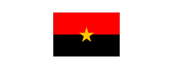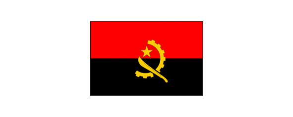 Собственный государственный флаг Анголы (пропорции 2: 3) впервые был поднят 11 ноября 1975 г. на центральной площади столицы страны – Луанды вместо спущенного флага Португалии. Его полотнище состоит из двух горизонтальных полос: верхней красного цвета и нижней – черного. В центре флага изображена золотистая эмблема: перекрещенные половина зубчатого колеса и нож-мачете, над которым пятиконечная звезда.