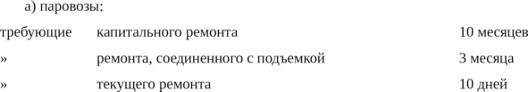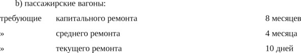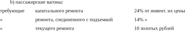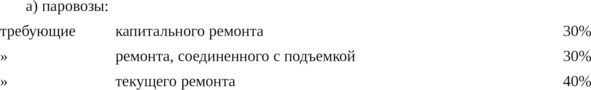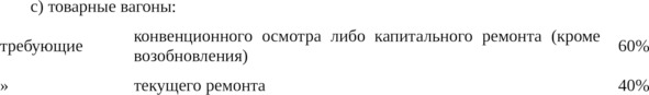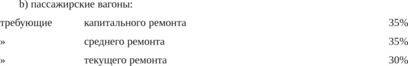 b) Количество подвижного состава, требующего ремонта, не должно превышать следующих норм от всего возвращаемого количества: 50% для паровозов, 35% для пассажирских вагонов и 20% для товарных вагонов.