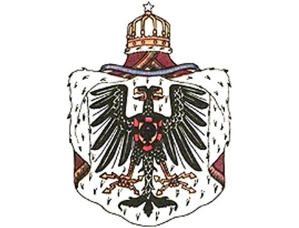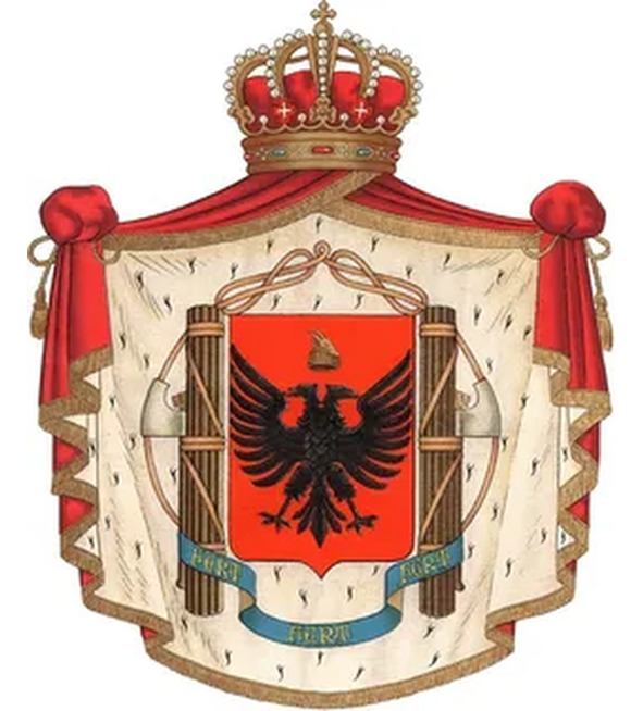 Первый же герб собственно Албании был создан после провозглашения в 1914 г. княжества во главе с германским принцем Вильгельмом. На мантии, увенчанной специально созданной короной особого вида с пятилучевой звездой, размещался черный двуглавый, похожий на прусского, орел с серебряным вооружением, держащий в лапах пучки золотых стрел. На груди орла был помещен щит с видоизмененным гербом рода Вид-Рункель – павлином. Под орлом располагалась лента с девизом: «Верностью и правдой».