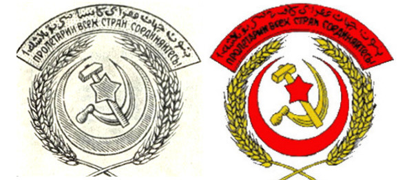 Первым же гербом советской республики стала расположенная внутри опрокинутого полумесяца пятилучевая звезда поверх перекрещенных серпа и молота.
