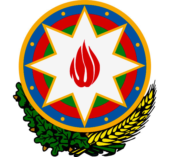На его круглом щите синяя окружность символизирует тюркство, красная – современность, зеленая – ислам. Поверх окружностей – символ райской сферы – серебряная восьмилучевая звезда, в ее центре – пламя – символ героической борьбы азербайджанского народа. Снизу щит обрамлен колосом и веткой лавра, изображаемых иногда перевязанными лентой национальных цветов.
